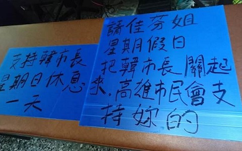 抗議的牌子上寫著“支持韓市長星期日休息一天”,“請佳芬姐星期假日把韓市長關(guān)起來,高雄市民會支持你的!”其他人也留言“你。!好樣的。!”“我們都同意佳芬姐星期日把市長關(guān)在家睡覺”“一周要龜息一天,晚上八點(diǎn)必須回家休息”。(中國臺灣網(wǎng) 娟子)