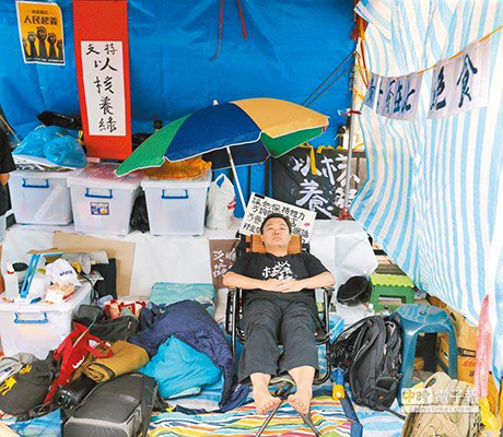 圖為去年9月黃士修絕食靜坐抗議“中選會”拒收聯(lián)署書補(bǔ)件。(圖片來源:臺灣“中時電子報”)
