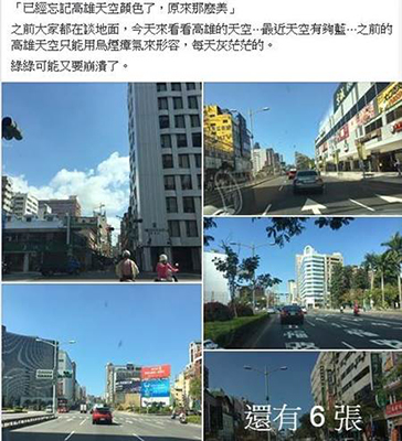 去年8月臺灣南部連日暴雨,高雄市道路出現(xiàn)5000個“天坑”,引發(fā)民怨。高雄市長韓國瑜上任后,市府努力鋪路,網(wǎng)友在臉譜網(wǎng)“韓國瑜后援會”接力發(fā)“路平”照片歡天喜地。還有網(wǎng)友在“韓國瑜后援會”連發(fā)數(shù)張“藍(lán)天”照片說,“已經(jīng)忘記高雄天空顏色了,原來那么美”,之前大家都在談地面,今天來看看高雄的天空,最近天空有夠藍(lán),之前的高雄天空只能用烏煙瘴氣來形容,每天灰茫茫的。該網(wǎng)友還笑說“綠綠可能又要崩潰了!