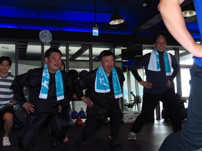 民進黨候選人余天(中)5日邀請游鍚堃(右)、新北市議員陳啟能(左),一起到健身房“操一下”。(圖片來源:臺灣“中時電子報”)