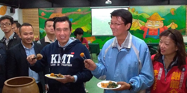 臺(tái)南市“立委”候選人謝龍介今日(11日)與馬英九一起參訪瓜瓜園,品嘗地瓜料理。(圖片來源:臺(tái)灣《聯(lián)合報(bào)》)