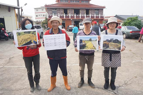 13日下午麻豆柚農(nóng)郭新聰(左二)與其他柚農(nóng)拿出去年照片,證明去年麻豆柚子確實(shí)因產(chǎn)量過(guò)剩賣不好,個(gè)別果農(nóng)將自家賣不出去的柚子傾倒在自家果園土地旁。(圖片來(lái)源:臺(tái)灣“中時(shí)電子報(bào)”)
