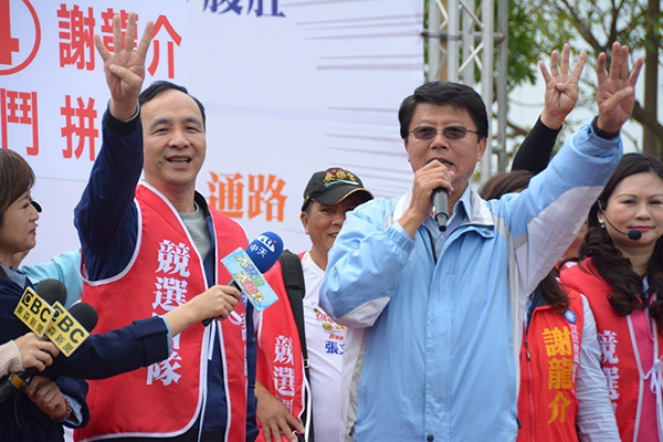 前新北市長朱立倫(左)今天到臺南為謝龍介站臺。(圖片來源:臺灣《聯(lián)合報(bào)》)