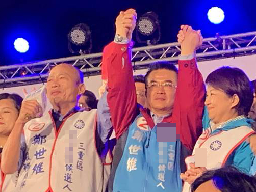 韓國瑜(左)盧秀燕(右)緊握鄭世維手,高呼加油。(圖片來源:臺(tái)灣“中時(shí)電子報(bào)”)