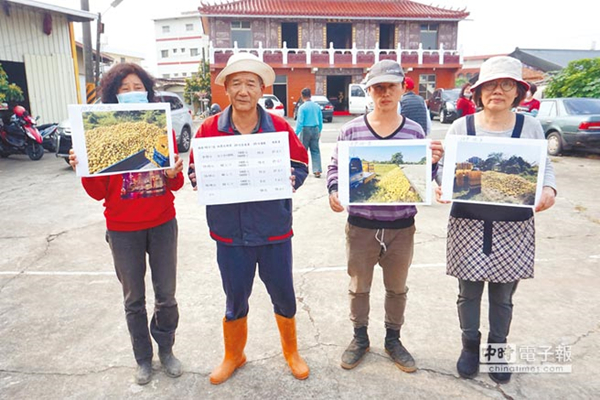 圖為麻豆區(qū)柚農(nóng)郭新聰(左二)受訪,拿出去年10月文旦(柚子)傾倒在田地照片,證明去年文旦確實滯銷。(圖片來源:臺灣“中時電子報”)