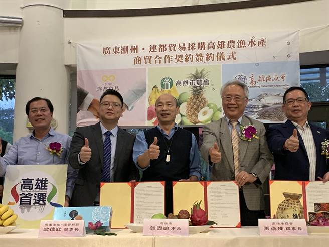 19日,在高雄市長韓國瑜(中)見證下,廣東潮州連都貿(mào)易公司董事長歐德壯(左二)與高雄市農(nóng)會理事長蕭漢。ㄓ叶、高雄區(qū)漁會理事長謝龍隱(右一)簽下1年采購10億(新臺幣)農(nóng)漁產(chǎn)品訂單。(圖片來源:臺灣“中時電子報”)