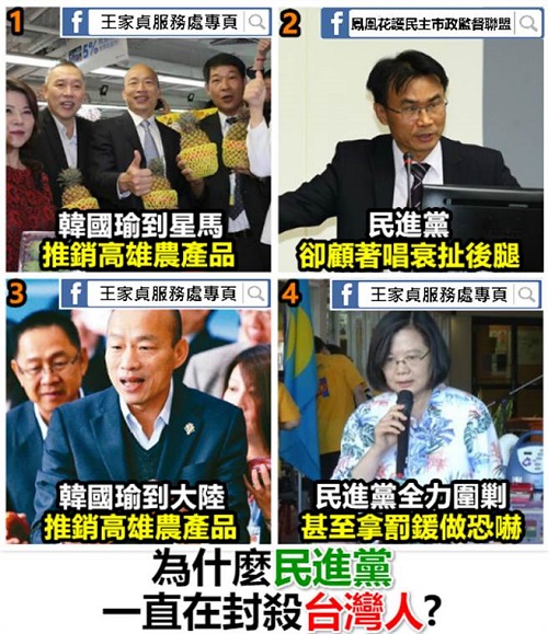 “鳳凰花護(hù)民主市政監(jiān)督聯(lián)盟”在臉書指出,韓國瑜到新馬推銷高雄農(nóng)產(chǎn)品,民進(jìn)黨卻顧著唱衰扯后腿;韓國瑜到大陸推銷高雄農(nóng)產(chǎn)品,民進(jìn)黨全力圍剿甚至拿罰款做恐嚇,“為什么民進(jìn)黨一直在封殺臺(tái)灣人?”
