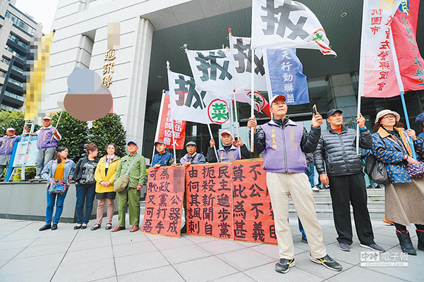 藍(lán)天行動(dòng)聯(lián)盟、桃園市基層佐警聯(lián)誼會(huì)等團(tuán)體1日前往“NCC”,力挺“中天新聞臺(tái)”,控訴“NCC”對(duì)中天裁罰是箝制新聞自由。(圖片來(lái)源:臺(tái)灣“中時(shí)電子報(bào)”)