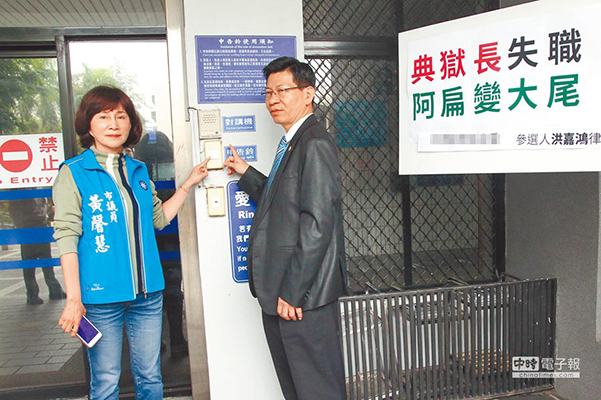 律師洪嘉鴻(右)及臺中市議員黃馨慧(左)控告臺中監(jiān)獄典獄長邱鴻基,明知陳水扁違反保外醫(yī)治等規(guī)定卻不作為涉及瀆職。(圖片來源:臺灣“中時電子報”)
