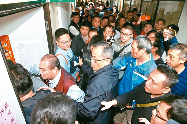 漁民不滿看直播無法表達(dá)心聲,前往主會(huì)場(chǎng)但遭阻擋后發(fā)生推擠沖突,最后氣憤離席。(圖片來源:臺(tái)灣《聯(lián)合報(bào)》)