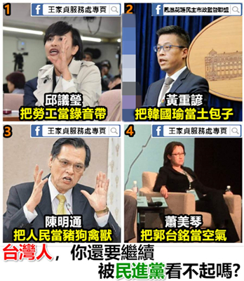 蔡當(dāng)局執(zhí)政后不僅推出的政策不得民心,許多官員的言論也經(jīng)常引發(fā)爭(zhēng)議。對(duì)此,“鳳凰花護(hù)民主市政監(jiān)督聯(lián)盟”P(pán)O文指出,綠營(yíng)“立委”邱議瑩,把勞工當(dāng)“錄音帶”;蔡英文辦公室發(fā)言人黃重諺,把高雄市長(zhǎng)韓國(guó)瑜當(dāng)“土包子”;臺(tái)陸委會(huì)主委陳明通把人民當(dāng)“豬狗禽獸”;民進(jìn)黨“立委”蕭美琴,把鴻海集團(tuán)總裁郭臺(tái)銘當(dāng)“空氣”。該粉專直言“臺(tái)灣人,你還要繼續(xù)被民進(jìn)黨看不起嗎?”(中國(guó)臺(tái)灣網(wǎng) 劉洪羊)