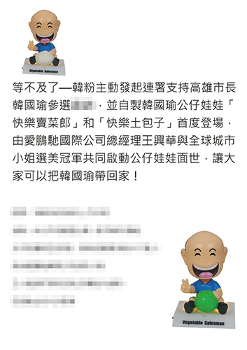“韓粉”親自設計“禿頭公仔”,號召全民一起來挺韓國瑜。(圖片取自臺媒)