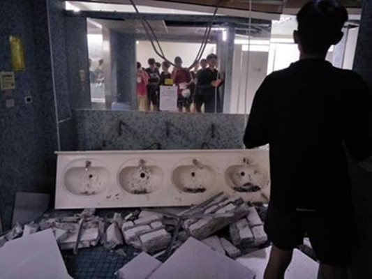 臺灣師范大學校舍發(fā)生磁磚掉落,男生宿舍洗手臺被震垮等情況(圖片來源:臺灣“聯(lián)合新聞網(wǎng)”)