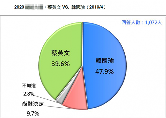 藍綠對決,韓國瑜以47.9%支持度贏過蔡英文的39.6%。(圖片取自臺媒)