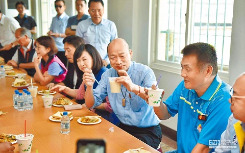 高雄市長韓國瑜夜宿臨海工業(yè)區(qū)勞工宿舍后,24日清晨即前往大林蒲鳳林宮祈福,并與勞工朋友及廟方人員共進(jìn)早餐。(圖片來自臺媒)
