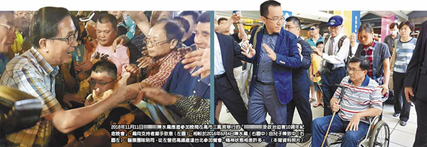 2018年11月11日陳水扁應(yīng)邀參加晚間在高市三鳳宮舉行的紀(jì)念晚會(huì),陳水扁向支持者握手致意(左圖)。相較于2016年6月4日陳水扁(右圖中)由兒子陳致中(右圖左)、醫(yī)療團(tuán)隊(duì)陪同,從左營(yíng)搭高鐵直達(dá)臺(tái)北參加餐會(huì),精神狀態(tài)相差許多。(圖片來源:臺(tái)灣“中時(shí)電子報(bào)”)
