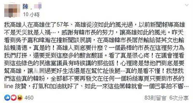 對此,有網(wǎng)友在臉譜網(wǎng)(facebook)上發(fā)文指出,她在高雄住了57年,高雄從沒如此的風(fēng)光過,以前新聞報道高雄不是天災(zāi)就是人禍,“感謝有韓市長的努力,讓高雄如此的風(fēng)光”。