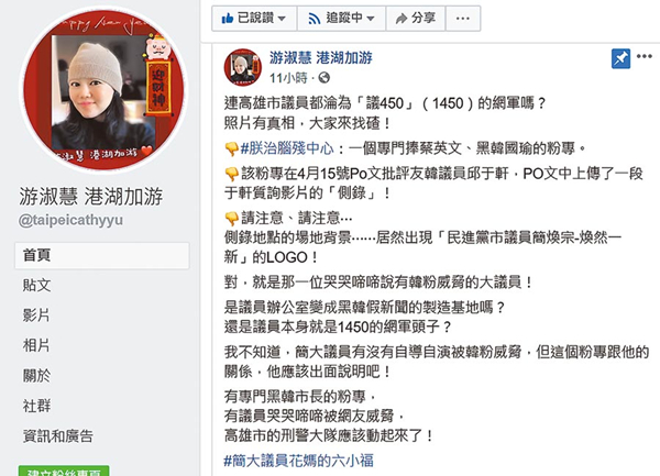 中國臺灣網(wǎng)5月8日訊 據(jù)臺灣《聯(lián)合報》報道,國民黨臺北市議員游淑慧昨天(7日)上午踢爆黑韓粉絲專頁“朕治腦殘中心”竟出現(xiàn)民進黨議員簡煥宗的LOGO后,她進一步在臉譜網(wǎng)(Facebook)貼文,用三張圖質(zhì)疑“黑韓者聯(lián)盟”。
