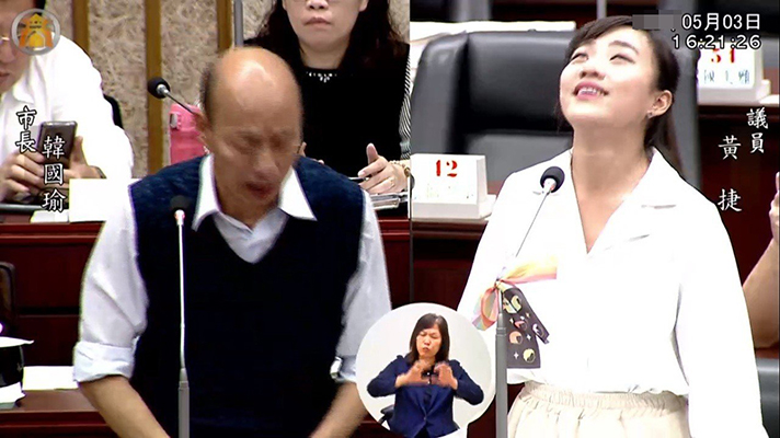 “時(shí)代力量”高雄市議員黃捷(右)3日質(zhì)詢(xún)市長(zhǎng)韓國(guó)瑜有關(guān)自由經(jīng)濟(jì)貿(mào)易區(qū)時(shí),因韓國(guó)瑜回答“高雄要發(fā)大財(cái)”而驚呼仰頭翻白眼。(圖片取自臺(tái)媒)