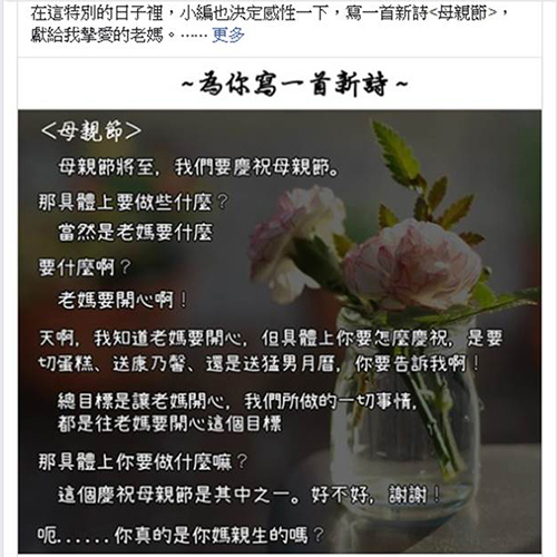 “內(nèi)政部”昨日為慶祝母親節(jié),臉譜網(wǎng)粉絲團(tuán)小編特地發(fā)出新詩(shī)慶祝,全文如下:母親節(jié)將至,我們要慶祝母親節(jié)。那具體上要做些什么?當(dāng)然是老媽要什么。要什么啊?老媽要開(kāi)心啊!天啊,我知道老媽要開(kāi)心,但具體上你要怎么慶祝,是要切蛋糕、送康乃馨,還是送猛男月歷,你要告訴我。】偰繕(biāo)是讓老媽開(kāi)心,我們所做的一切事情,都是往老媽要開(kāi)心這個(gè)目標(biāo)。那具體上你要做什么嘛?這個(gè)慶祝母親節(jié)是其中之一。好不好,謝謝!呃……你真的是你媽親生的嗎?