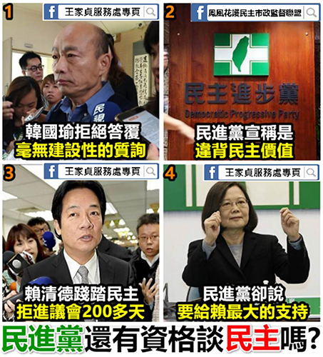 韓國(guó)瑜拒答無(wú)建設(shè)性的質(zhì)詢被指違背民主價(jià)值,臉譜網(wǎng)網(wǎng)友則拿賴清德當(dāng)臺(tái)南市長(zhǎng)時(shí)不進(jìn)議會(huì)一事諷刺。(圖片取自臺(tái)媒)
