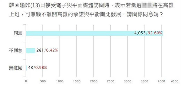 中國臺(tái)灣網(wǎng)5月15日訊 據(jù)臺(tái)灣“中時(shí)電子報(bào)”報(bào)道,高雄市長韓國瑜日前接受專訪時(shí)松口表示,愿接受國民黨征召、參選2020,更表示“選上就在高雄上班”。對(duì)此,臺(tái)灣“中時(shí)電子報(bào)”昨日(14日)推出網(wǎng)絡(luò)投票,廣邀網(wǎng)友參與投票表達(dá)看法。截至今天早上七點(diǎn)半,有高達(dá)92.6%網(wǎng)友同意韓國瑜當(dāng)選后在高雄上班,力挺韓國瑜。