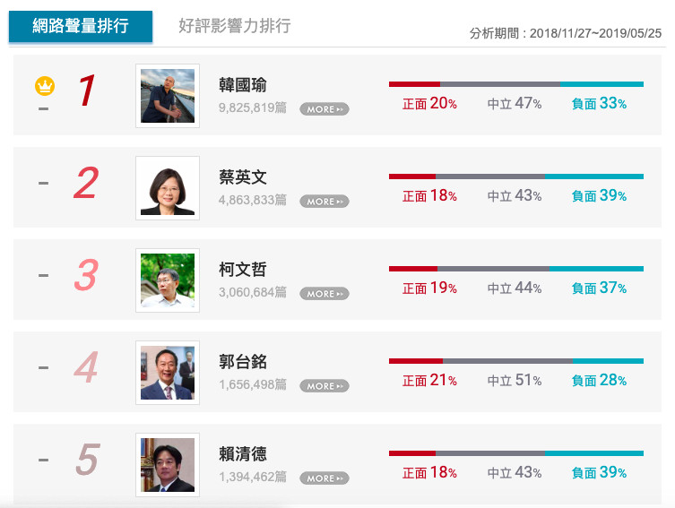 在網(wǎng)絡(luò)聲量排名部分,韓國瑜雖近日聲量下滑,但仍維持第1名,蔡英文近日上升到第2名,臺北市長柯文哲則下降1名至第3名。原本上個(gè)月還在第19名的鴻海董事長郭臺銘,竄升到第4名,臺當(dāng)局前“行政院長”賴清德則是第5名。