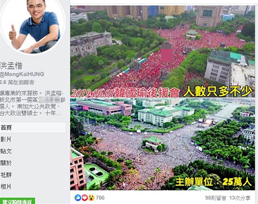 洪孟楷在臉譜網(wǎng)(facebook)指出:對(duì)比5年多前“白衫軍”號(hào)稱25萬人上街頭,隔天報(bào)紙報(bào)道有20萬人,一樣的面積場(chǎng)景,1日韓國瑜的造勢(shì)對(duì)比只多不少,要不就是當(dāng)年白衫軍灌水灌很大、不然就是現(xiàn)在綠營在半夜吹口哨壯膽。