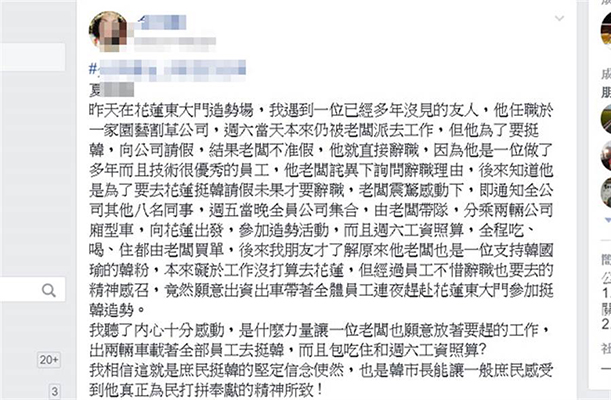 網(wǎng)友在臉譜網(wǎng)(facebook)分享:“昨天在花蓮東大門造勢(shì)場(chǎng),我遇到一位已經(jīng)多年沒(méi)見(jiàn)的友人,他任職于一家園藝割草公司,周六當(dāng)天本來(lái)仍被老板派去工作,但他為了要挺韓,向公司請(qǐng)假,結(jié)果老板不準(zhǔn)假,他就直接辭職。因?yàn)樗且晃蛔隽硕嗄甓壹夹g(shù)很優(yōu)秀的員工,他老板詫異下詢問(wèn)辭職理由,后來(lái)知道他是為了要去花蓮?fù)n請(qǐng)假未果才要辭職,老板震驚感動(dòng)下,即通知全公司其他八名同事,周五當(dāng)晚全員公司集合,由老板帶隊(duì),分乘兩輛公司廂型車,向花蓮出發(fā),參加造勢(shì)活動(dòng),而且周六工資照算,全程吃、喝、住都由老板買單。后來(lái)我朋友才了解原來(lái)他老板也是一位支持韓國(guó)瑜的韓粉,本來(lái)礙于工作沒(méi)打算去花蓮,但經(jīng)過(guò)員工不惜辭職也要去的精神感召,竟然愿意出資出車帶著全體員工連夜趕赴花蓮東大門參加挺韓造勢(shì)!