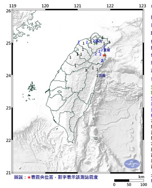 然而,這起地震后,早晨7時(shí)02分左右,宜蘭蘇澳又發(fā)生4.6級(jí)地震,震中位于宜蘭縣政府南偏東方14.8公里,地震深度為66.4公里。各地最大震度宜蘭縣蘇澳、新北市新店3級(jí)。臺(tái)北、桃園2級(jí)。花蓮、基隆、新竹、南投、苗栗、臺(tái)中1級(jí)。(中國(guó)臺(tái)灣網(wǎng) 李寧)