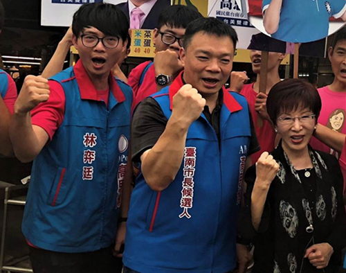 國民黨前主席洪秀柱(右一)表達愿意南征臺南艱困選區(qū),去年代表國民黨參選臺南市長的高思博(中)表達全力支持。(圖片來源:臺灣“中時電子報”)