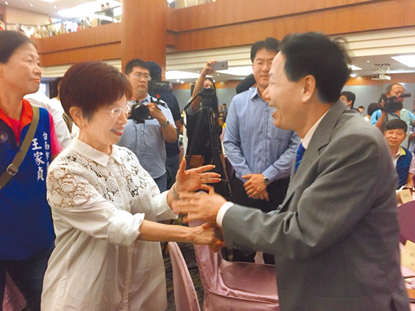 國(guó)民黨前主席洪秀柱(前左)到臺(tái)南出席林燕祝之友會(huì)餐會(huì),受到許多鄉(xiāng)親打氣加油。(圖片來源:臺(tái)灣《中國(guó)時(shí)報(bào)》)
