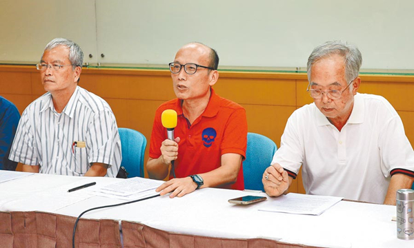 30日,嘉義大學(xué)歷史系教授吳昆財(cái)(中)主持記者會,表示高一新生要用的新教科書有多處刻意“去中國化”,不符合真實(shí)的歷史。(圖片來源:臺灣《中國時(shí)報(bào)》)