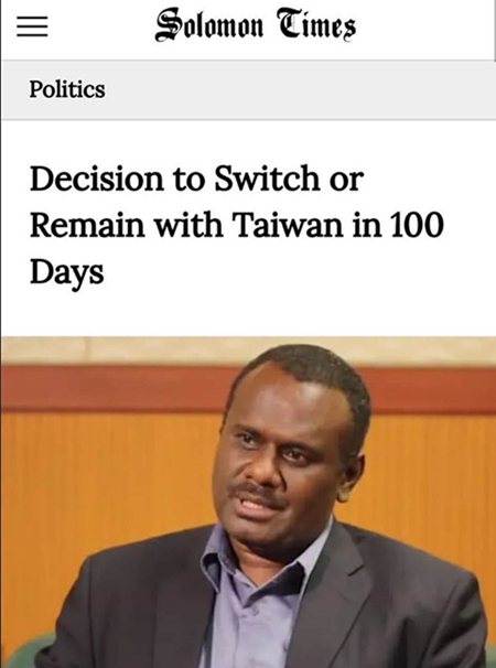 《所羅門時(shí)報(bào)》6月5日就曾以頭條新聞報(bào)道,所羅門群島外交部長(zhǎng)耶利米·馬涅勒(Jeremiah Manele)表示,在未來(lái)100天內(nèi)將決定是否將其對(duì)臺(tái)灣的承認(rèn)轉(zhuǎn)變?yōu)榇箨。轉(zhuǎn)眼間,100日將至。