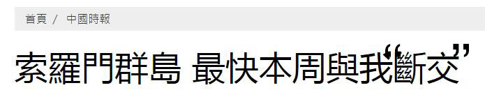 臺(tái)灣《中國(guó)時(shí)報(bào)》報(bào)道稱,從蔡英文2017年訪問(wèn)所羅門群島開(kāi)始,不時(shí)就傳出所羅門想要和大陸建交的消息。所羅門若確定與臺(tái)灣“斷交”,臺(tái)灣將只剩16個(gè)所謂的“邦交國(guó)”。
