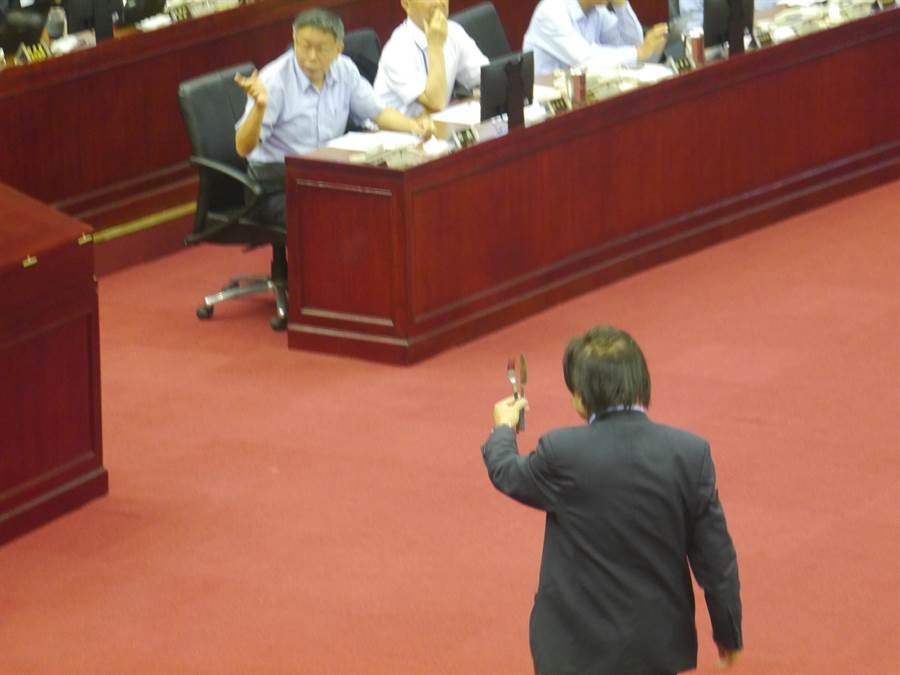 臺北市議員王世堅今(11日)在臺北市議會上,拿出刀叉送給柯文哲,叫柯別再用刀叉吃人肉。(圖片來源:臺灣“中時電子報”)