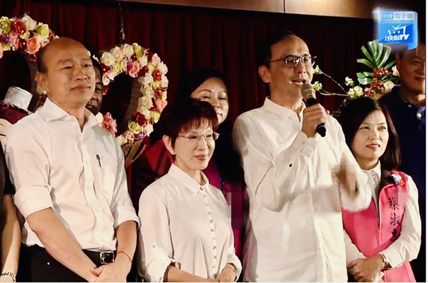 國(guó)民黨2020大選提名人韓國(guó)瑜今(22日)中午為國(guó)民黨前主席、國(guó)民黨臺(tái)南市第六選區(qū)"立委"參選人洪秀柱站臺(tái),與前新北市長(zhǎng)朱立倫一起同臺(tái)。(圖片來(lái)源:臺(tái)灣“中時(shí)電子報(bào)”)