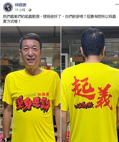 林國(guó)慶下定決心要打破“明文規(guī)定”、勢(shì)力龐大的陳明文,在臉譜網(wǎng)(facebook)秀出“起義戰(zhàn)服”,問(wèn)大家敢穿嗎?(圖片取自臺(tái)媒)