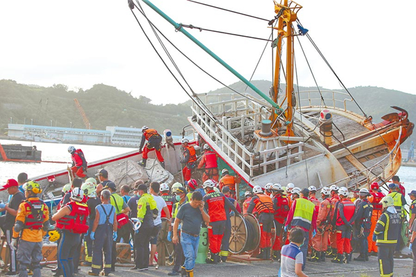 宜蘭縣南方澳跨港大橋1日驚傳坍塌意外,漁船遭壓并疑似還有多名外籍員工受困,臺海軍駁船將受困船只拉出,在救難人員協(xié)力下,將船只拉靠岸,救援人員隨即進入搜救。(圖片來源:臺灣“中時電子報”)