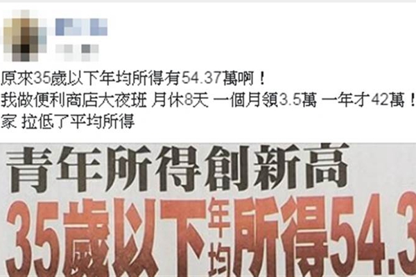 有網(wǎng)友轉(zhuǎn)發(fā)新聞,說(shuō)“原來(lái)35歲以下年均所得有54.37萬(wàn)!我做便利商店大夜班,月休8天,一個(gè)月領(lǐng)3.5萬(wàn),一年才42萬(wàn)!我對(duì)不起大家,拉低了平均所得!