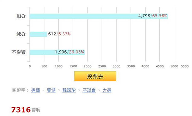 截至今日中午12點,參與投票者達7316人,認(rèn)為韓國瑜不訪美對選情是加分的網(wǎng)友有4798個,占比達65.58%。(圖片來源:臺灣“中時電子報”)