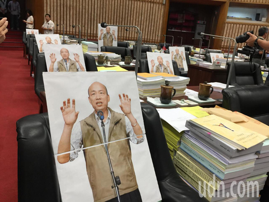 由于高雄市長(zhǎng)韓國瑜請(qǐng)假,民進(jìn)黨議員上午在議事廳門口和每位民進(jìn)黨籍議員的座位上放著韓國瑜人形立牌。(圖片來源:臺(tái)灣“聯(lián)合新聞網(wǎng)”)