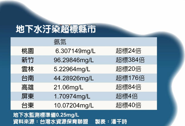彰化縣綠色資源人文保育協(xié)會理事長吳麗慧表示,地下水監(jiān)測標(biāo)準(zhǔn)值為0.25mg/L,但依據(jù)臺當(dāng)局“環(huán)保署”2015至2019年間的資料,發(fā)現(xiàn)臺南、高雄、新竹鄰近掩埋場的地下水污染最嚴(yán)重。尤其臨海的新竹市香山區(qū)浸水衛(wèi)生掩埋場地下水氨氮高達(dá)96.298mg/L(約為標(biāo)準(zhǔn)的384倍),位于曾文溪出?诘呐_南市安南區(qū)城西垃圾衛(wèi)生掩埋場氨氮測出57.56mg/L(約176倍),高雄大寮氨氮測到21.06mg/L(約84倍)。
