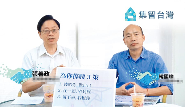 報(bào)道分析,因此由臺(tái)當(dāng)局前“行政院長(zhǎng)”張善政擔(dān)任副手,幾乎八九不離十。去年韓參選高雄市長(zhǎng),張善政多次南下獻(xiàn)策,并擔(dān)任政策顧問(wèn)。原本張有意參選,幾經(jīng)考慮宣布放棄后,立刻轉(zhuǎn)為支持韓國(guó)瑜,也大力協(xié)助籌組政策顧問(wèn)團(tuán),一路相挺。