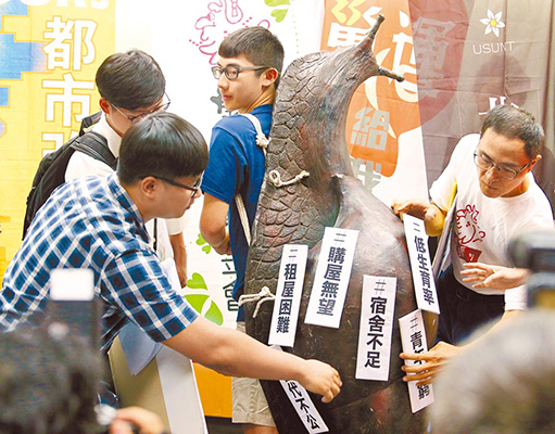 年輕人背負(fù)蝸牛殼,凸顯高房?jī)r(jià)壓力。(圖片來(lái)源:臺(tái)灣“中時(shí)電子報(bào)”)