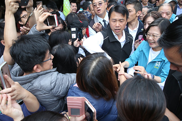 蔡英文30日上午到臺(tái)北南京市場(chǎng)輔選掃街,現(xiàn)場(chǎng)擠成一團(tuán)非常混亂。(圖片來(lái)源:臺(tái)灣《聯(lián)合報(bào)》)