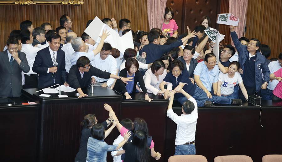 目前,臺灣島內(nèi)存在近300個政黨。民進黨當(dāng)局祭出的“政黨法”,將使眾多“一人政黨”或“僵尸政黨”難以生存。圖為臺“立法院”亂象。(圖片來源:臺灣“中時電子報”資料圖)