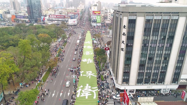 而“罷韓”活動(dòng)則宣稱(chēng)因人數(shù)爆表,延后30分開(kāi)始。發(fā)起人尹立還聲稱(chēng)游行共有50萬(wàn)人走出來(lái)。“罷韓”群眾刻意裝扮,隊(duì)伍起走后,有群眾拉起210米長(zhǎng)、12米寬的“光復(fù)高雄 保衛(wèi)臺(tái)灣”綠色大布條,超巨大布條下方?jīng)]有站人,被嘲諷是“人數(shù)作弊道具”。