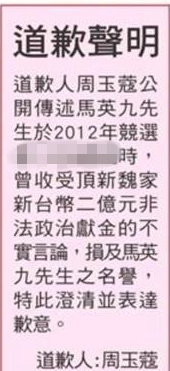 周玉蔻的道歉啟事內(nèi)容如下:道歉聲明,道歉人周玉蔻公開傳述馬英九先生于2012年競(jìng)選臺(tái)灣地區(qū)領(lǐng)導(dǎo)人時(shí),曾收受頂新魏家新臺(tái)幣二億元非法政治獻(xiàn)金的不實(shí)言論,損及馬英九先生之名譽(yù),特此澄清并表達(dá)歉意。道歉人:周玉蔻。(中國(guó)臺(tái)灣網(wǎng) 賈若瀾)