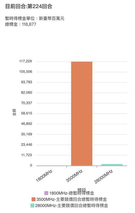 據(jù)報道,主流頻段3.5GHz在第225回合的最新競價,以暫時得標總標金1172.29億元,相較于該頻段總底價243億元,高出3.8倍,每一個區(qū)塊(10MHz)標金相當于43.42億元暫時得標。(中國臺灣網(wǎng) 李寧)